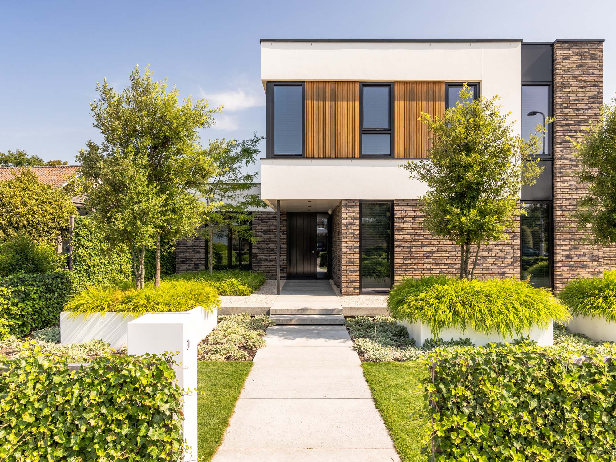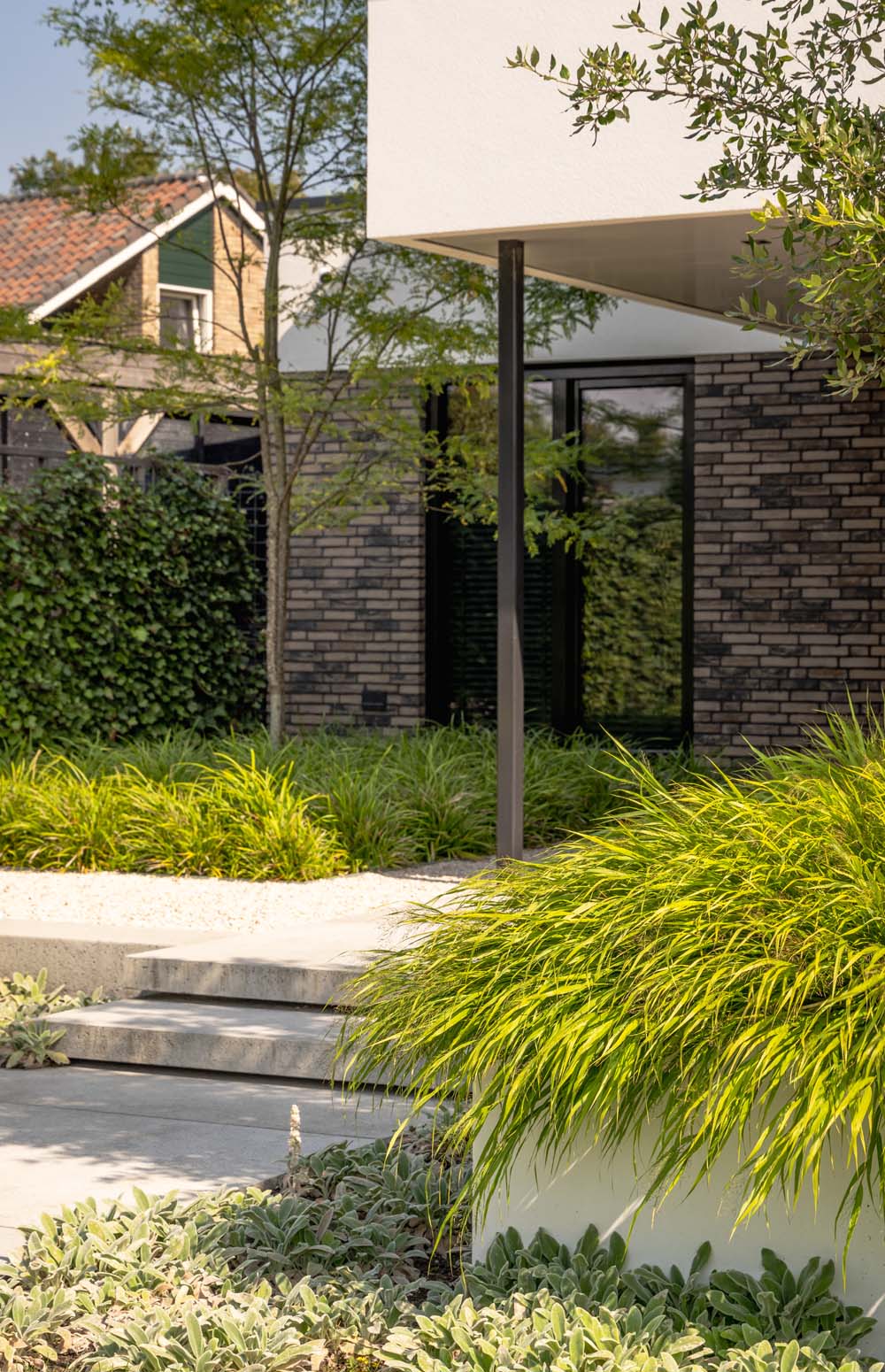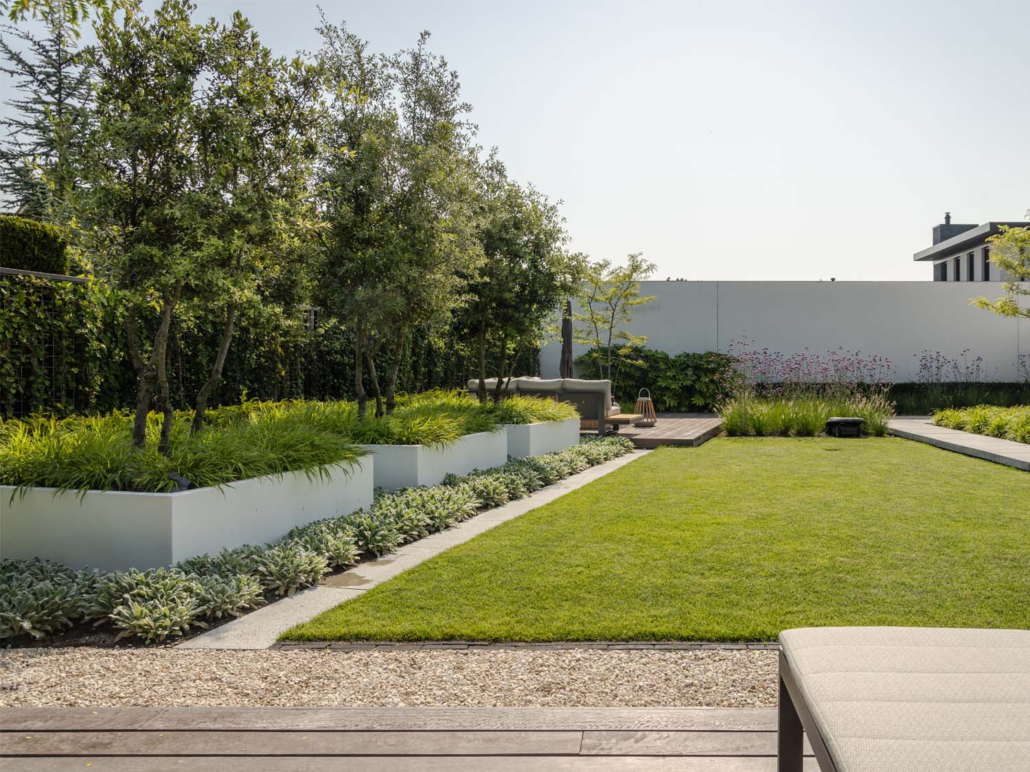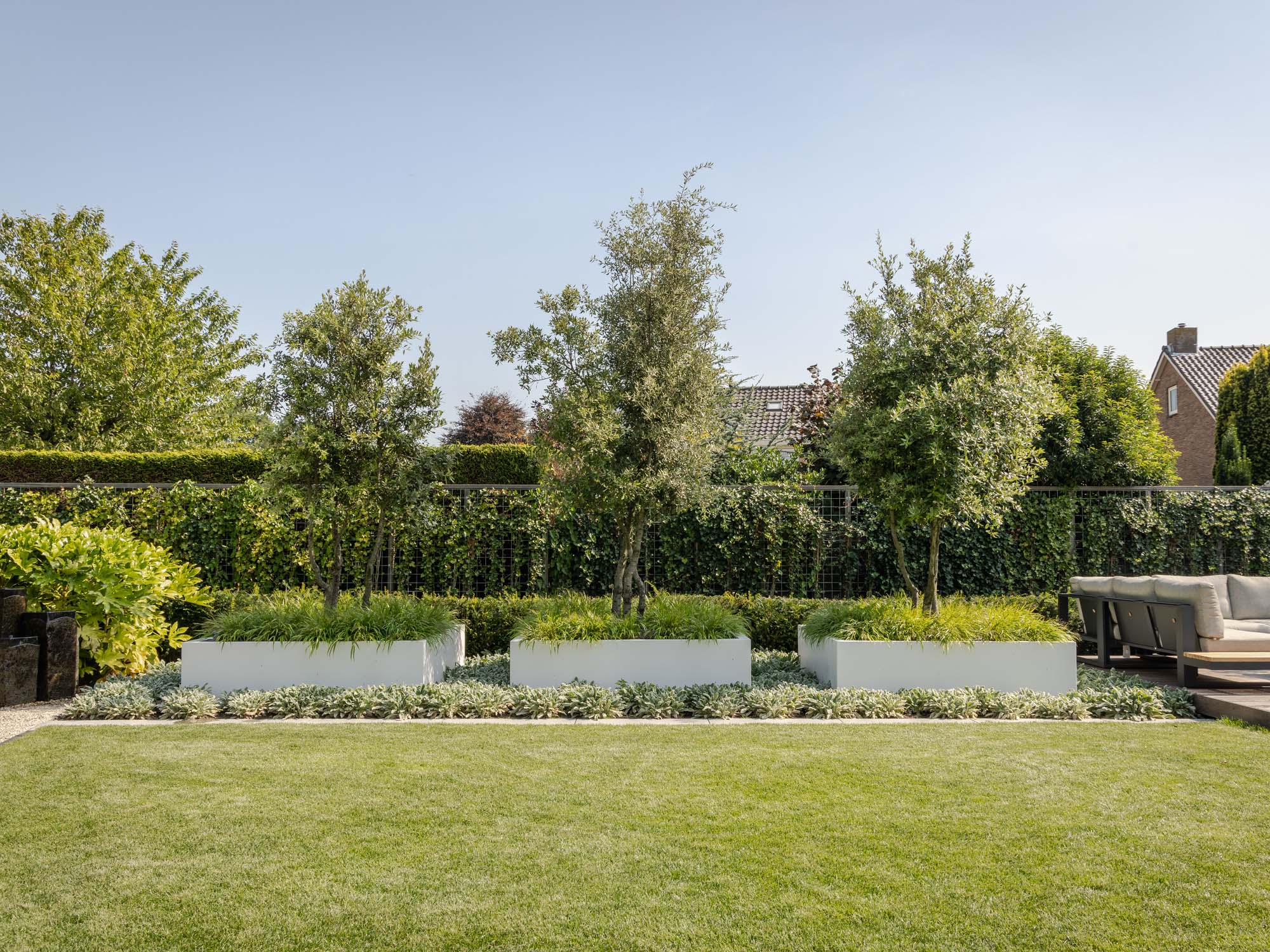 De tuin van deze moderne villa sluit naadloos aan op de woning. Doordat de blokvormige vormentaal van de woning is doorgezet in het tuinontwerp ontstaat er een fraai geheel. Los van deze blokvormige vakken zijn er lijnen bedacht die hier doorheen kruizen. In de voortuin is een beton loper bedacht die door de drie witte aluminium plantenbakken heen snijdt en is er een lijn van zwevende traptrede te zien. Doordat er veel herhaling zit in de zorgvuldig uitgekozen materialen ontstaat er een rustige buitenruimte waar de klant heerlijk van kan genieten.