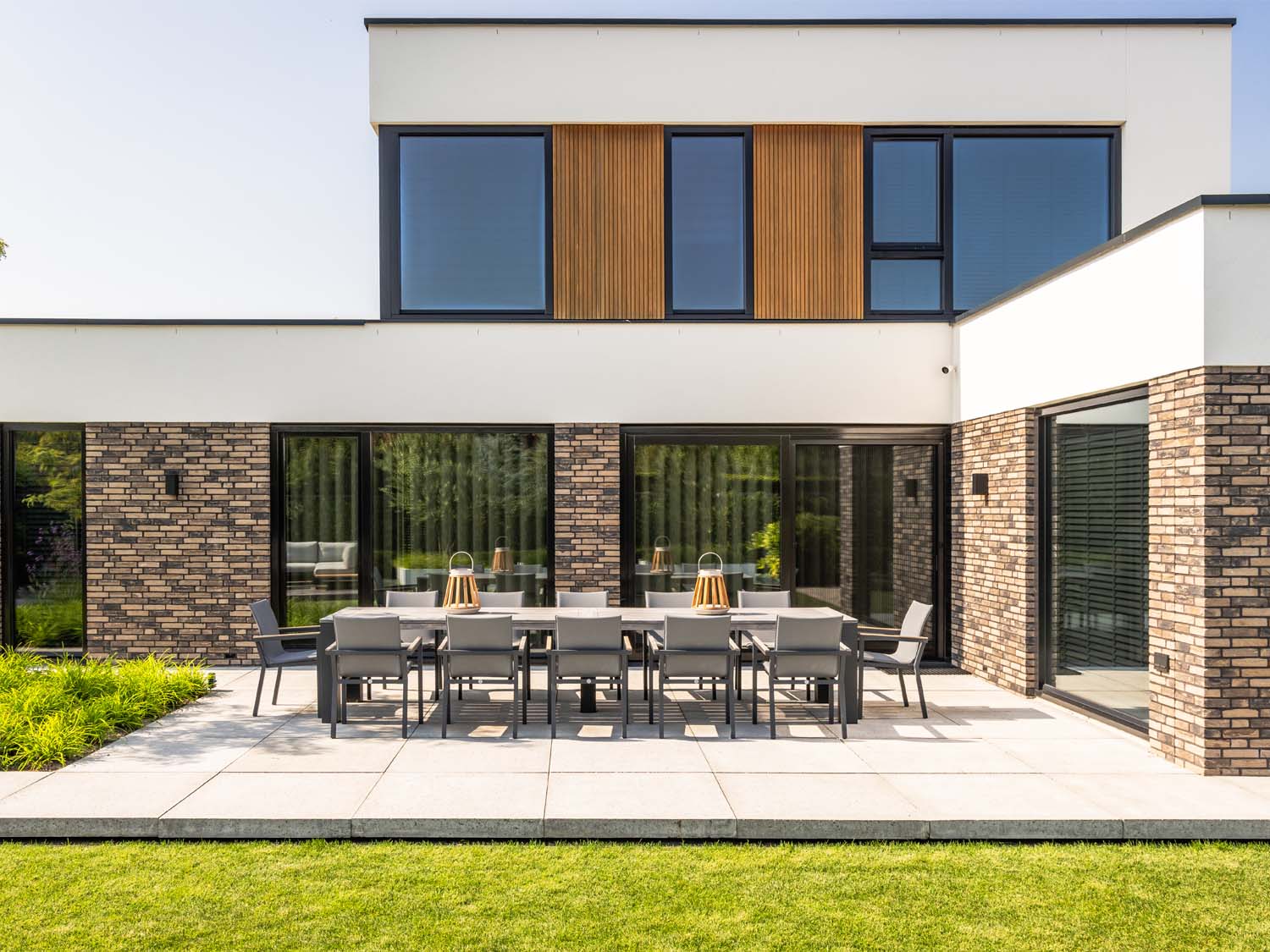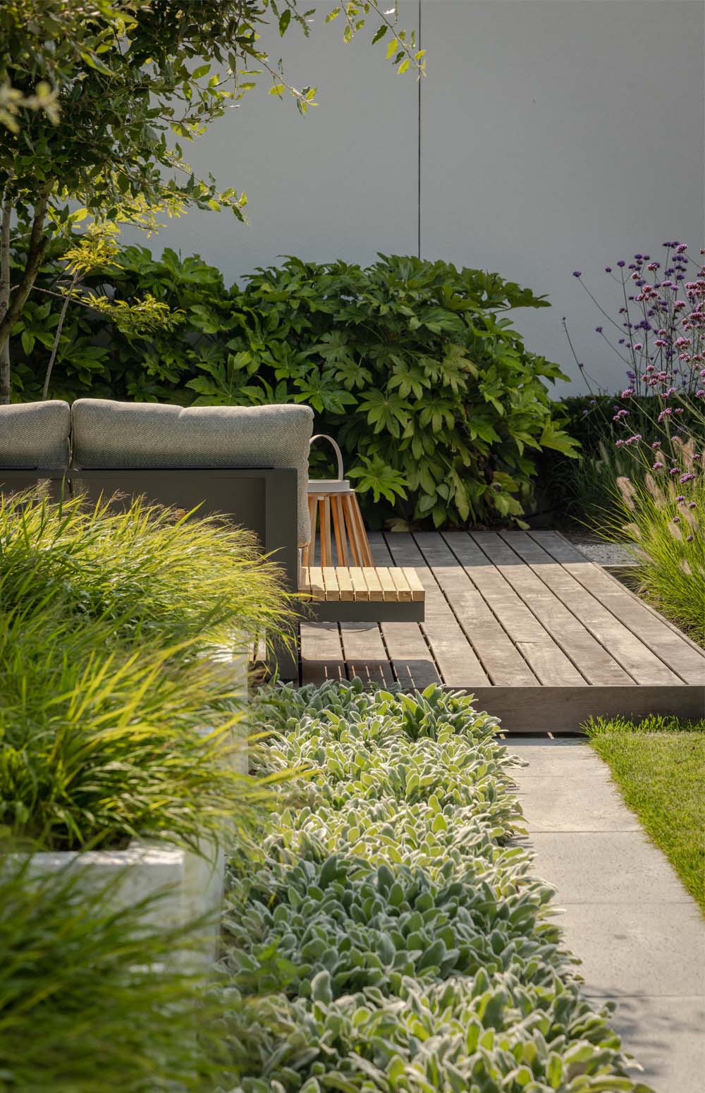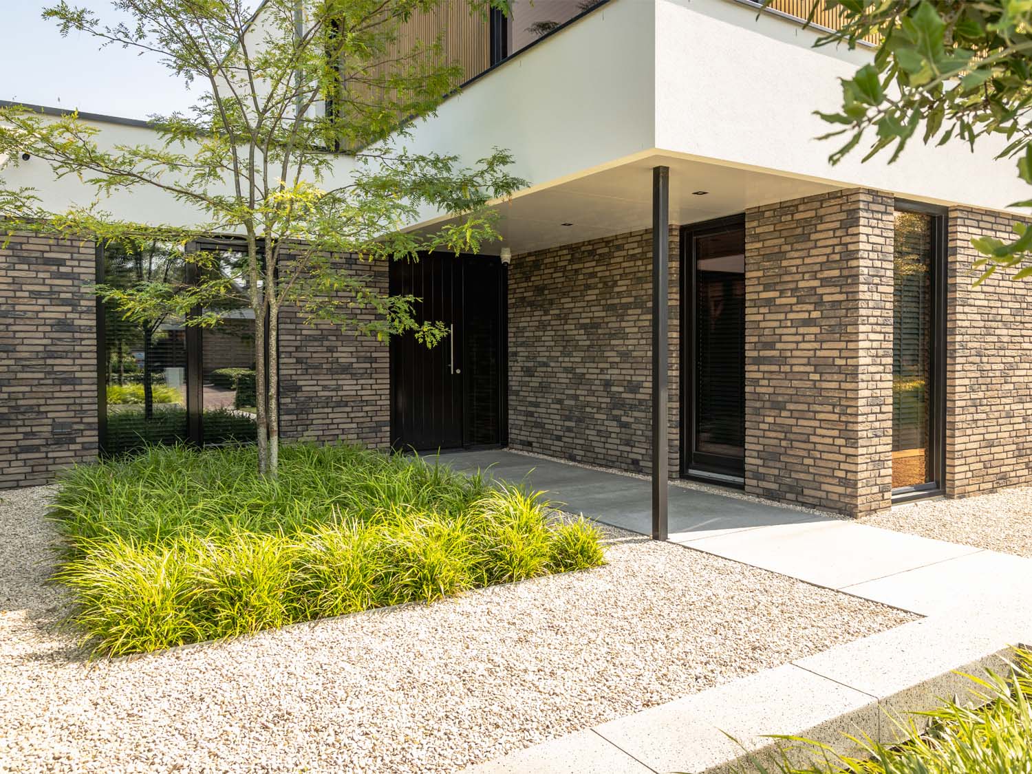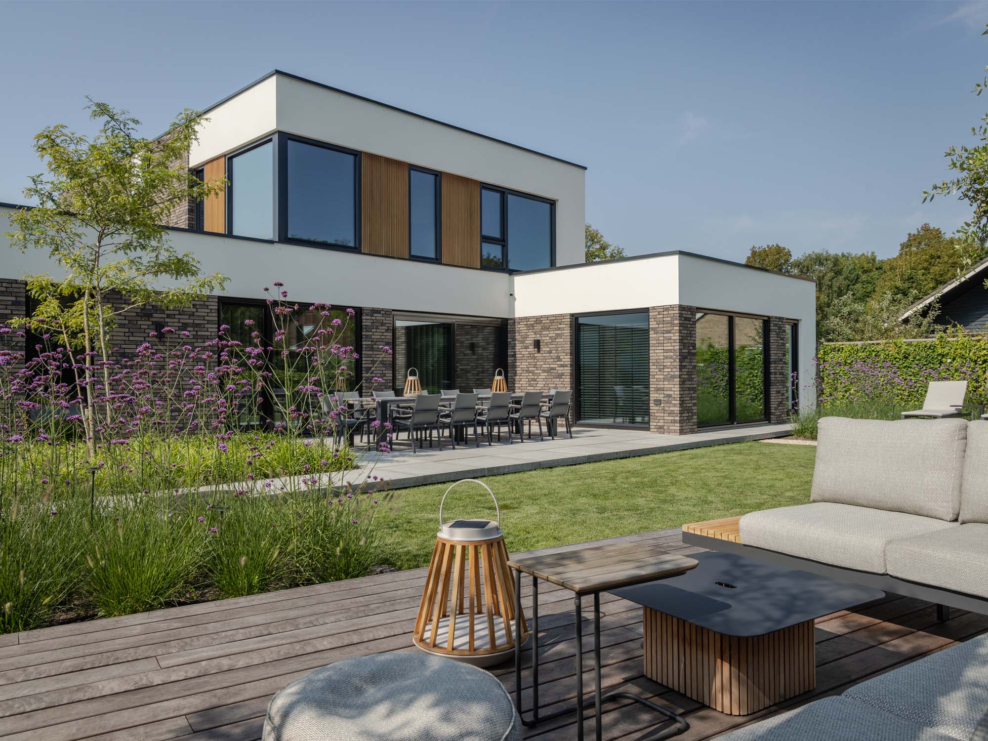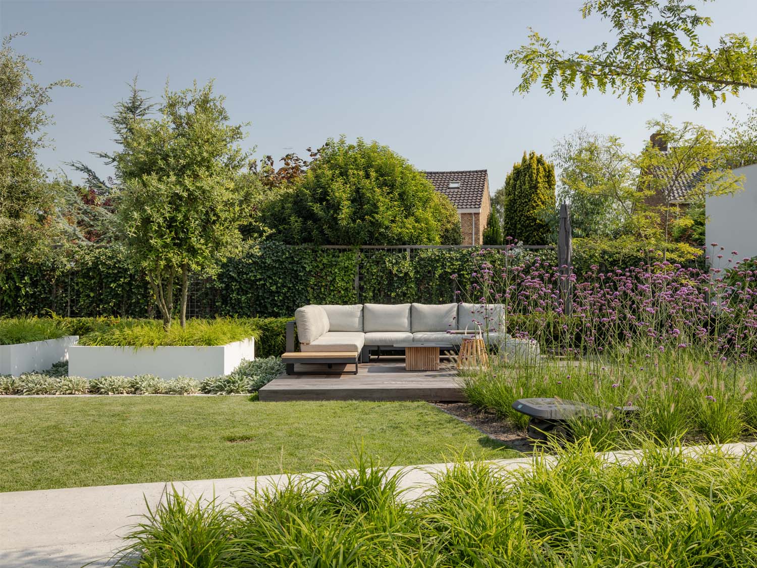 De tuin van deze moderne villa sluit naadloos aan op de woning. Doordat de blokvormige vormentaal van de woning is doorgezet in het tuinontwerp ontstaat er een fraai geheel. Los van deze blokvormige vakken zijn er lijnen bedacht die hier doorheen kruizen. In de voortuin is een beton loper bedacht die door de drie witte aluminium plantenbakken heen snijdt en is er een lijn van zwevende traptrede te zien. Doordat er veel herhaling zit in de zorgvuldig uitgekozen materialen ontstaat er een rustige buitenruimte waar de klant heerlijk van kan genieten.